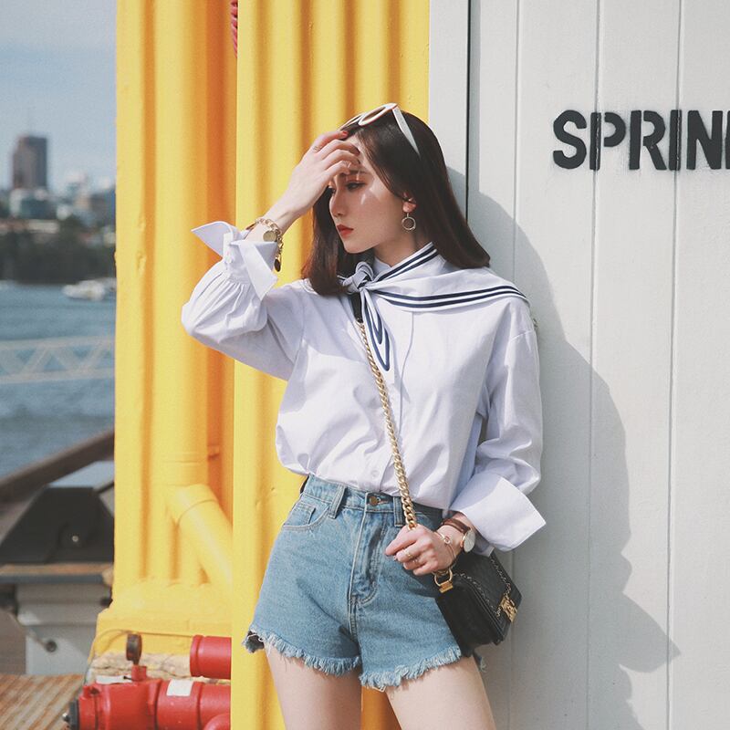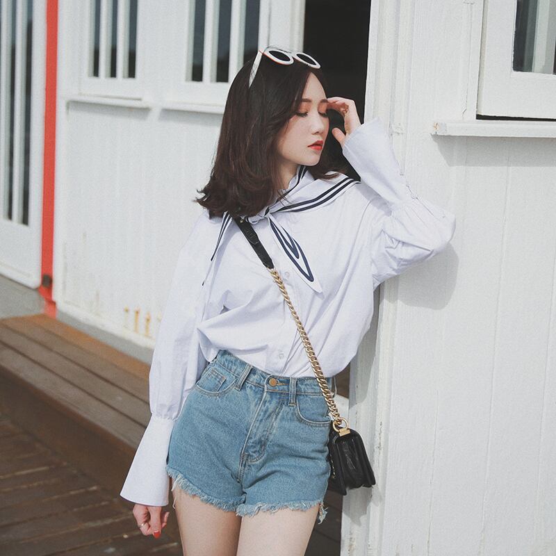 ≡ ≡ 新品 白ネイビーきれいめな長袖スリーブシャツブラウス ロング ホワイト ≡ オフィスファッション 通勤 通学 韓国系 ガーリー パーティー 食事会 海 リゾート 同窓会 記念日 旅行 お呼ばれ デート フェミニン AA19942759