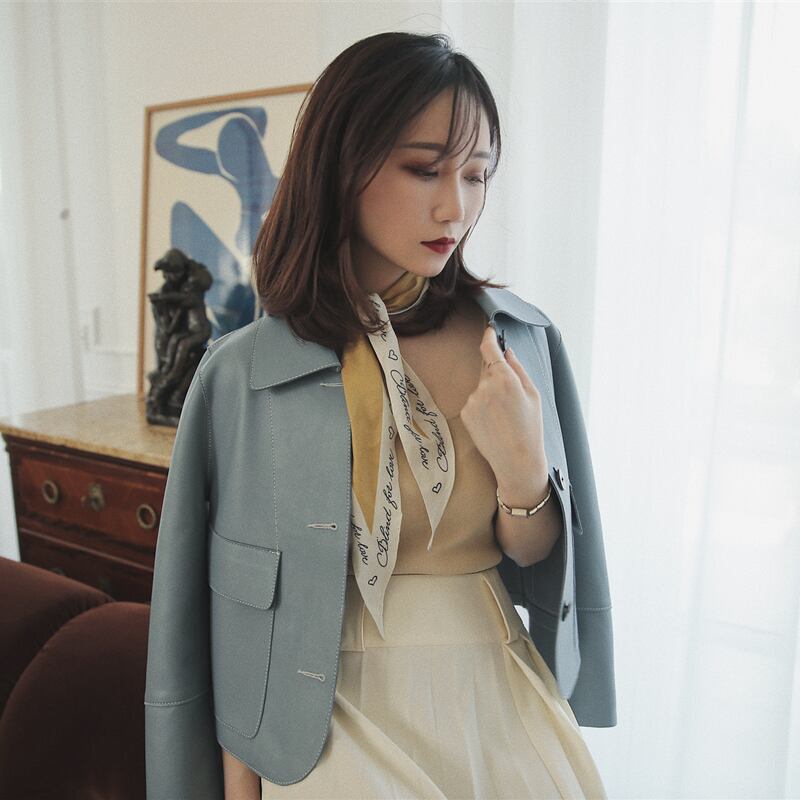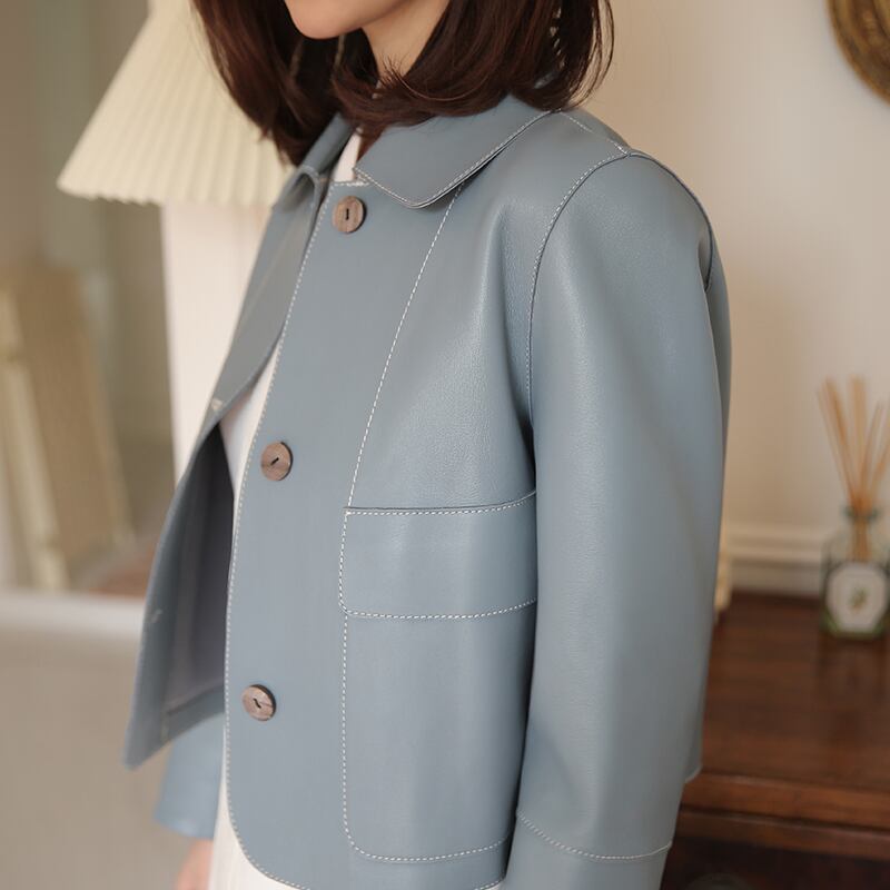 ≡ ≡ 新品 ショートレザージャケット ブルー大人女子☆ ピュア ≡ オフィスファッション 通勤 通学 韓国系 ガーリー パーティー 食事会 海 リゾート 同窓会 記念日 旅行 お呼ばれ デート フェミニン AA16917796