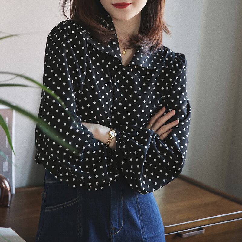 ≡ ≡ 新品 スタンダードブラック水玉ブラウス ♥カワイイ♥シャツブラウス ロング レトロ ≡ オフィスファッション 通勤 通学 韓国系 ガーリー パーティー 食事会 海 リゾート 同窓会 記念日 旅行 お呼ばれ デート フェミニン AA13361920