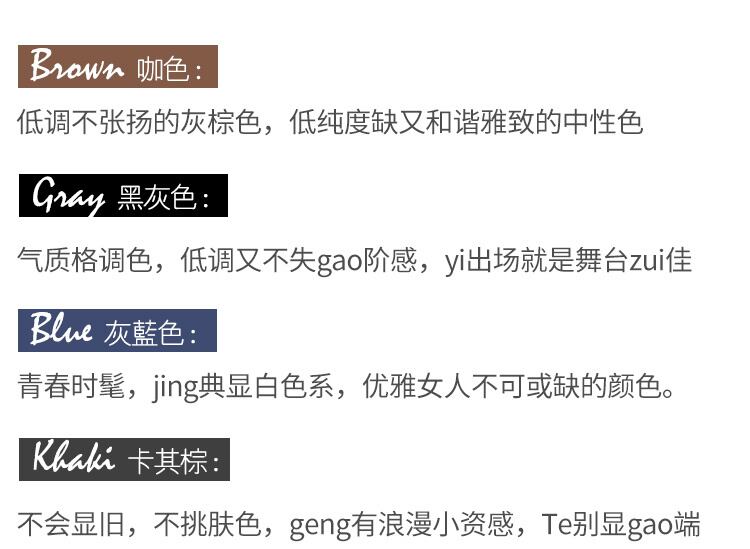 色:グレーブルー,ダークブラウン,褐色,カーキ,ライスアッシュ,ジンジャーイエロー,ブラックアッシュ,ライトブルー